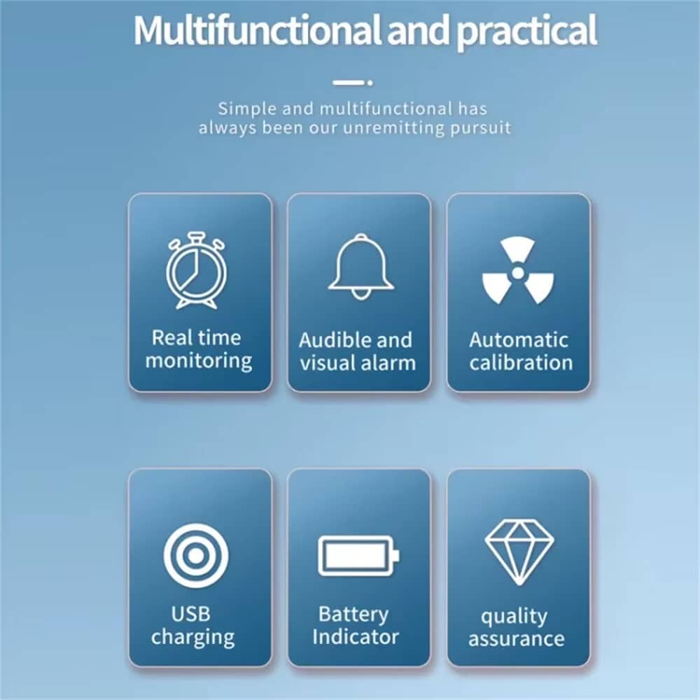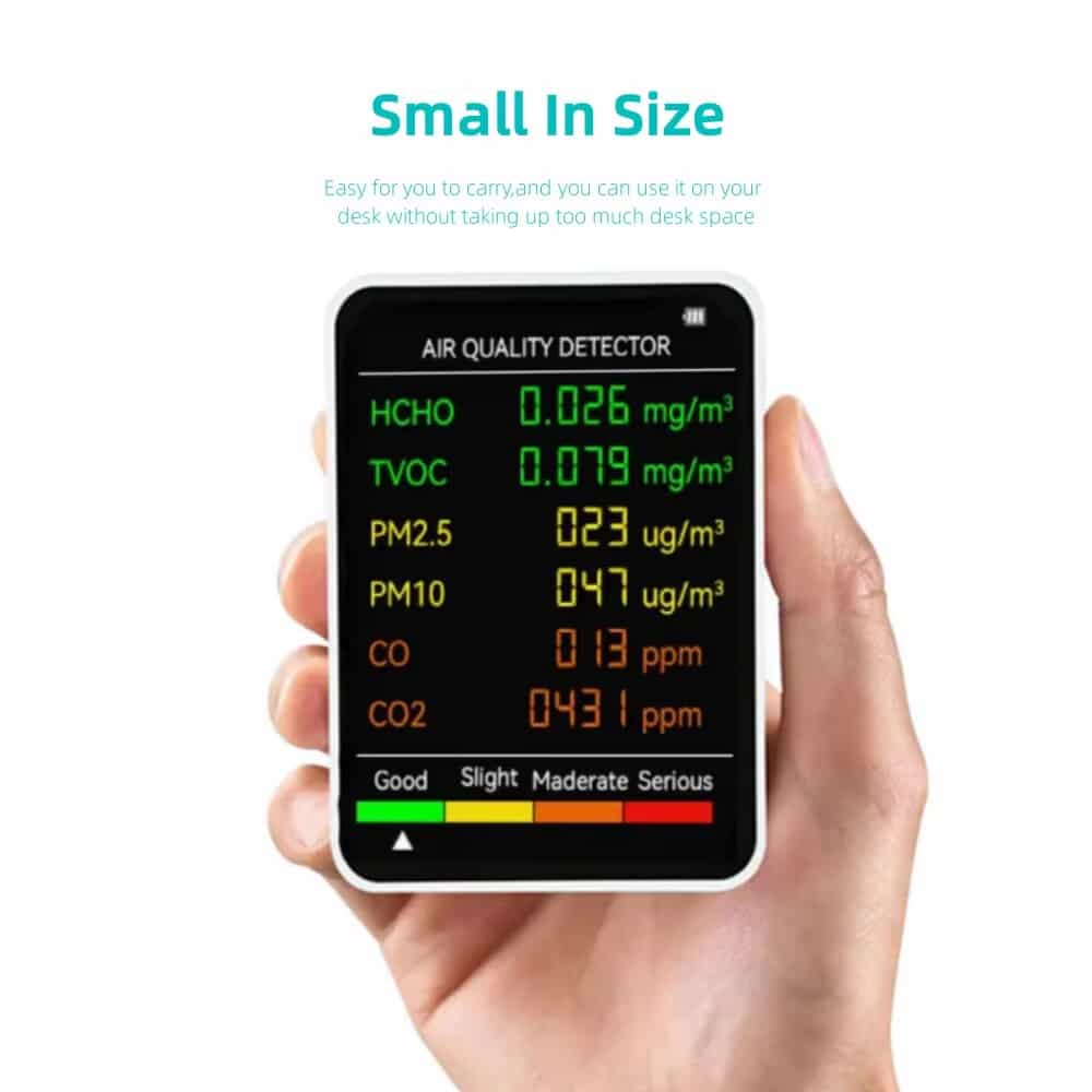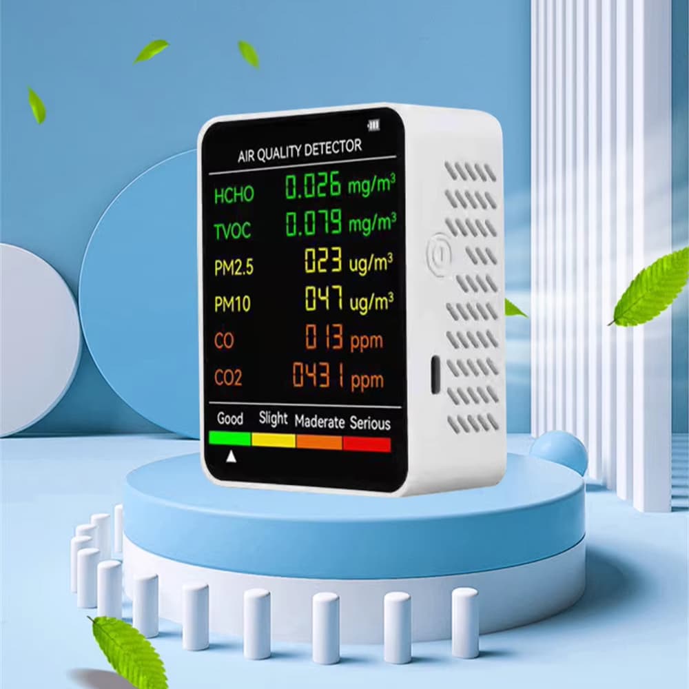 This comprehensive device monitors six key factors: particulate matter, chemical pollutants, carbon dioxide levels, temperature, humidity, and overall air quality index for total environmental awareness and safety.