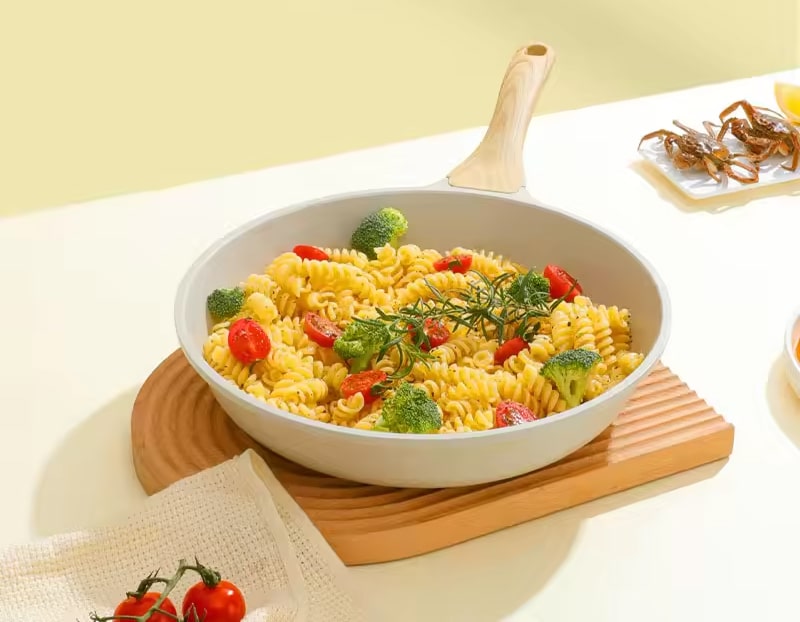 Questa padella è progettata principalmente per l'uso su piano cottura. Per mantenere l'integrità del manico effetto legno, si sconsiglia l'utilizzo diretto all'interno del forno.