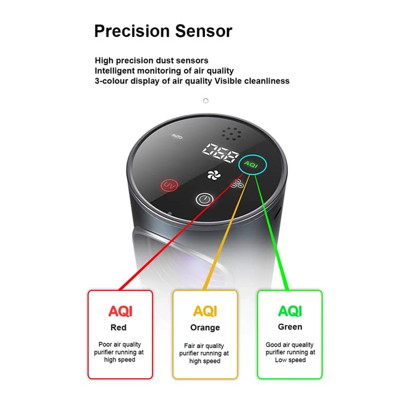 The built-in high-precision sensors continuously monitor air quality, displaying real-time PM2.5 levels through an intuitive color-coded system so you always know your air quality status.