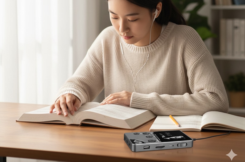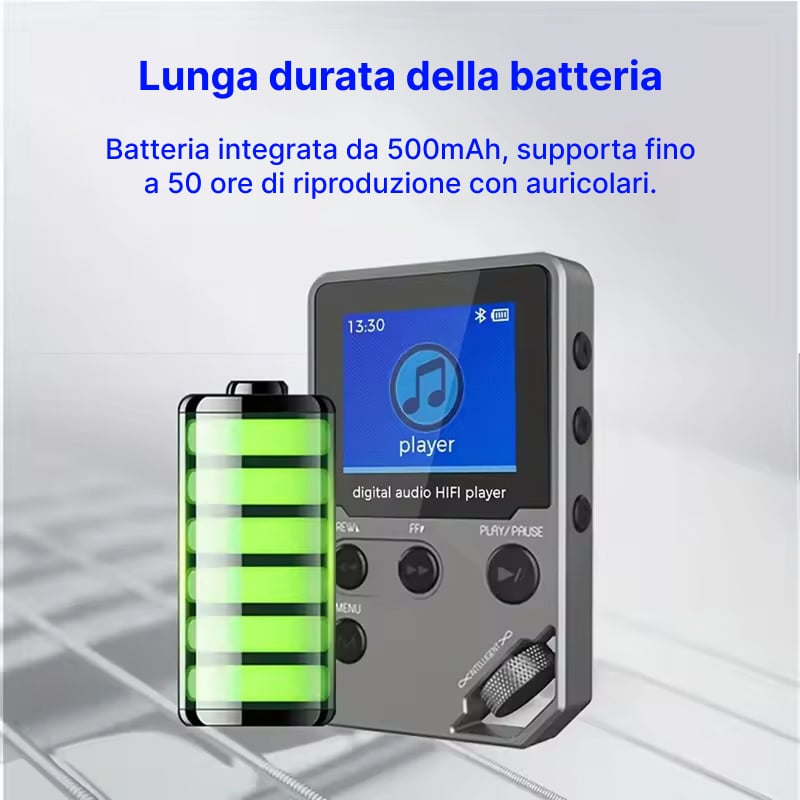 Inizia con 8GB di memoria integrata ed espandi fino a 128GB con schede microSD, fornendo spazio ampio per migliaia di brani, audiolibri e registrazioni personali.