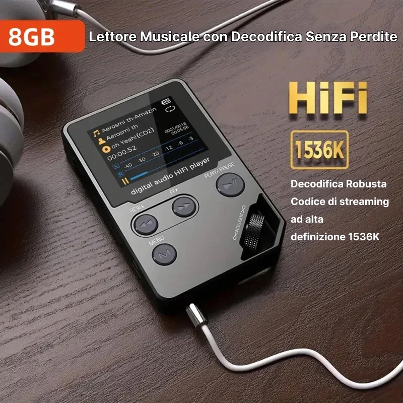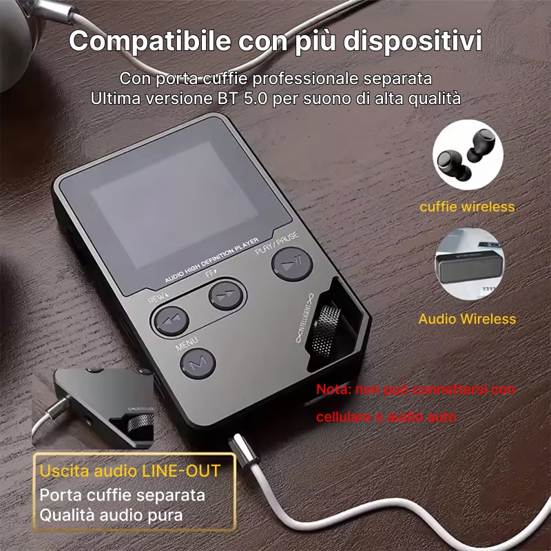 Sì, il lettore è compatibile con qualsiasi cuffia, auricolare o speaker Bluetooth standard, offrendo connessione stabile e qualità audio eccellente fino a 8 metri di distanza.