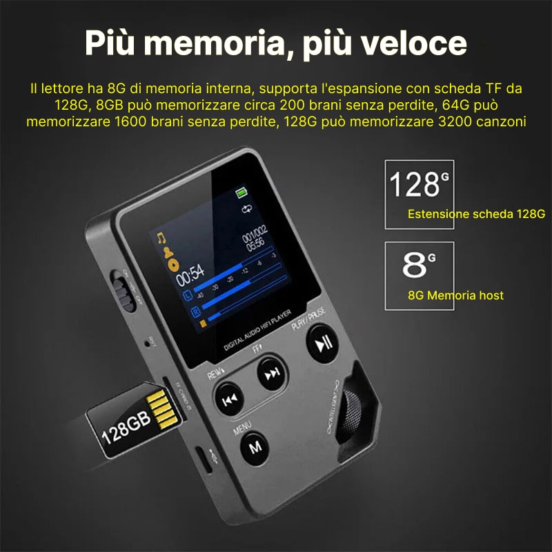 Sì, puoi espandere la memoria fino a 128GB utilizzando schede microSD compatibili, permettendoti di archiviare migliaia di brani, audiolibri e registrazioni senza limitazioni di spazio.