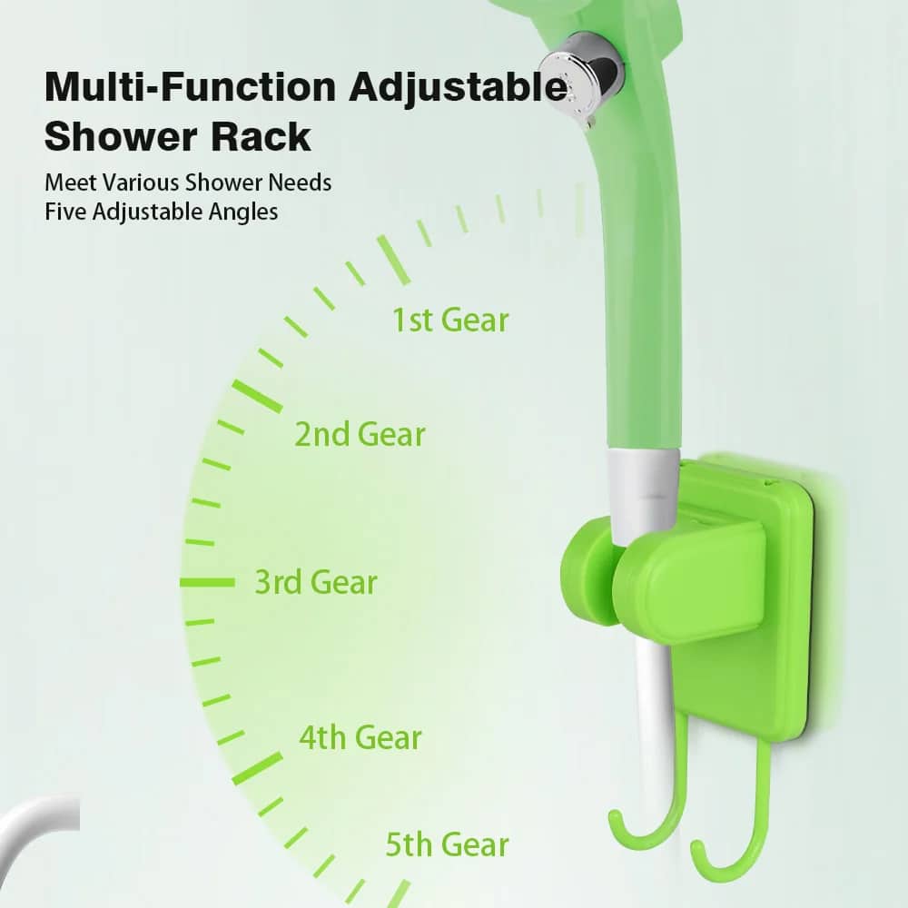 The package includes a shower head, shower rack, USB charging cable, two-meter PVC pipe, and a user manual.