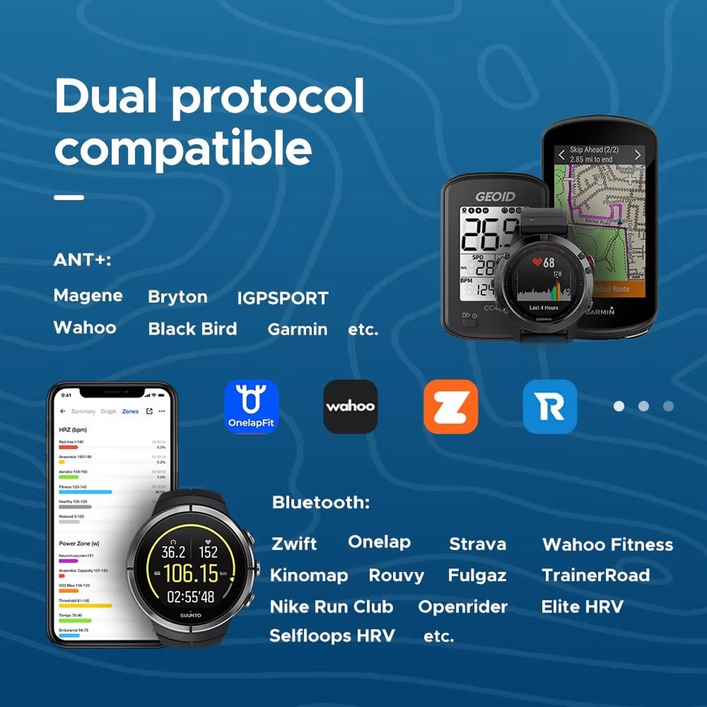 NanoxBeat offers seamless connectivity through both Bluetooth 4.2 and ANT+ protocols, ensuring compatibility with popular fitness apps like Strava, Zwift, and Garmin devices, plus GPS watches and bike computers for comprehensive workout tracking.
