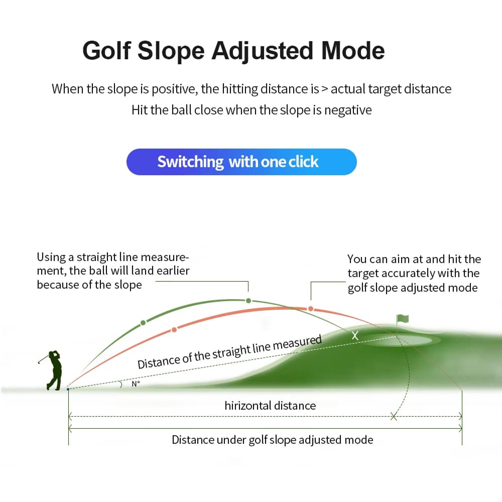 The slope compensation feature calculates the angle of elevation or decline and adjusts the distance measurement to give you the true yardage to the hole.