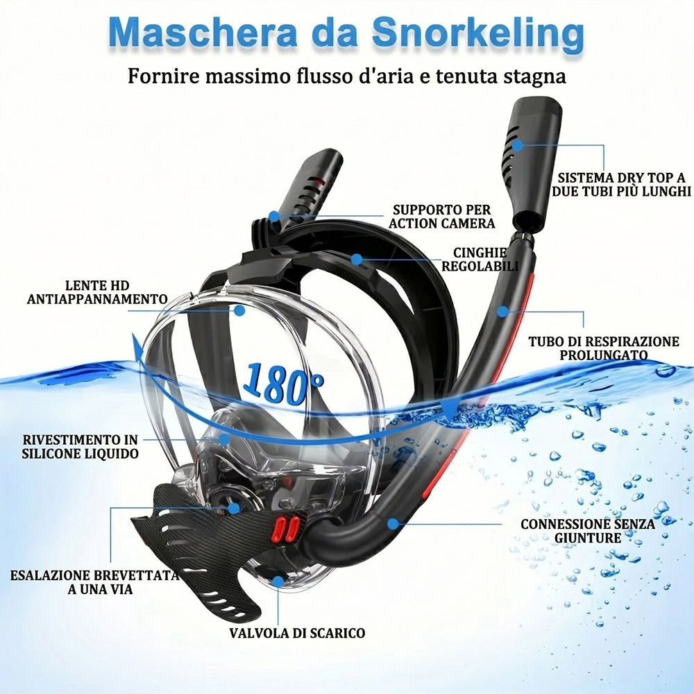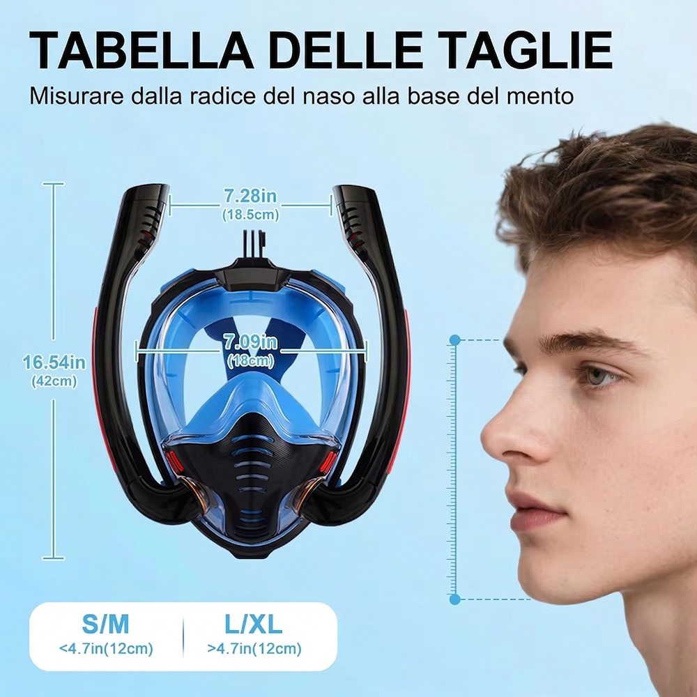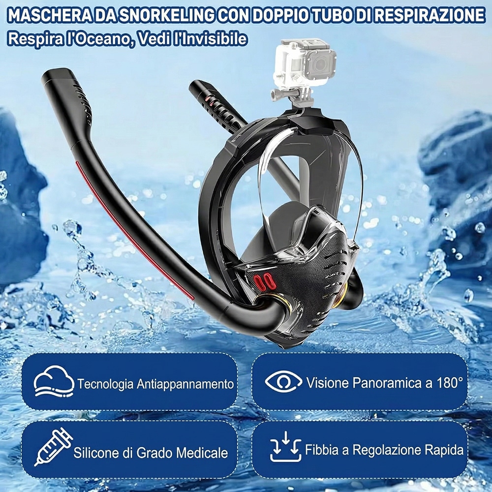 Sciacqua accuratamente la maschera con acqua dolce dopo ogni utilizzo per rimuovere sale e sabbia. Lasciala asciugare all'ombra, evitando l'esposizione diretta al sole per preservare il silicone.
