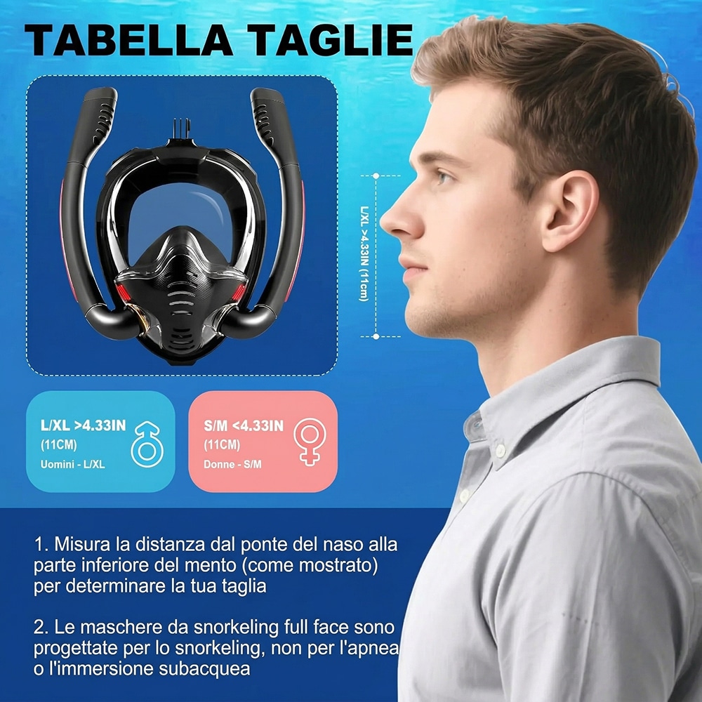 No, questa maschera è progettata esclusivamente per lo snorkeling in superficie. Non è adatta per immersioni profonde dove la pressione richiede attrezzature specifiche per la compensazione.