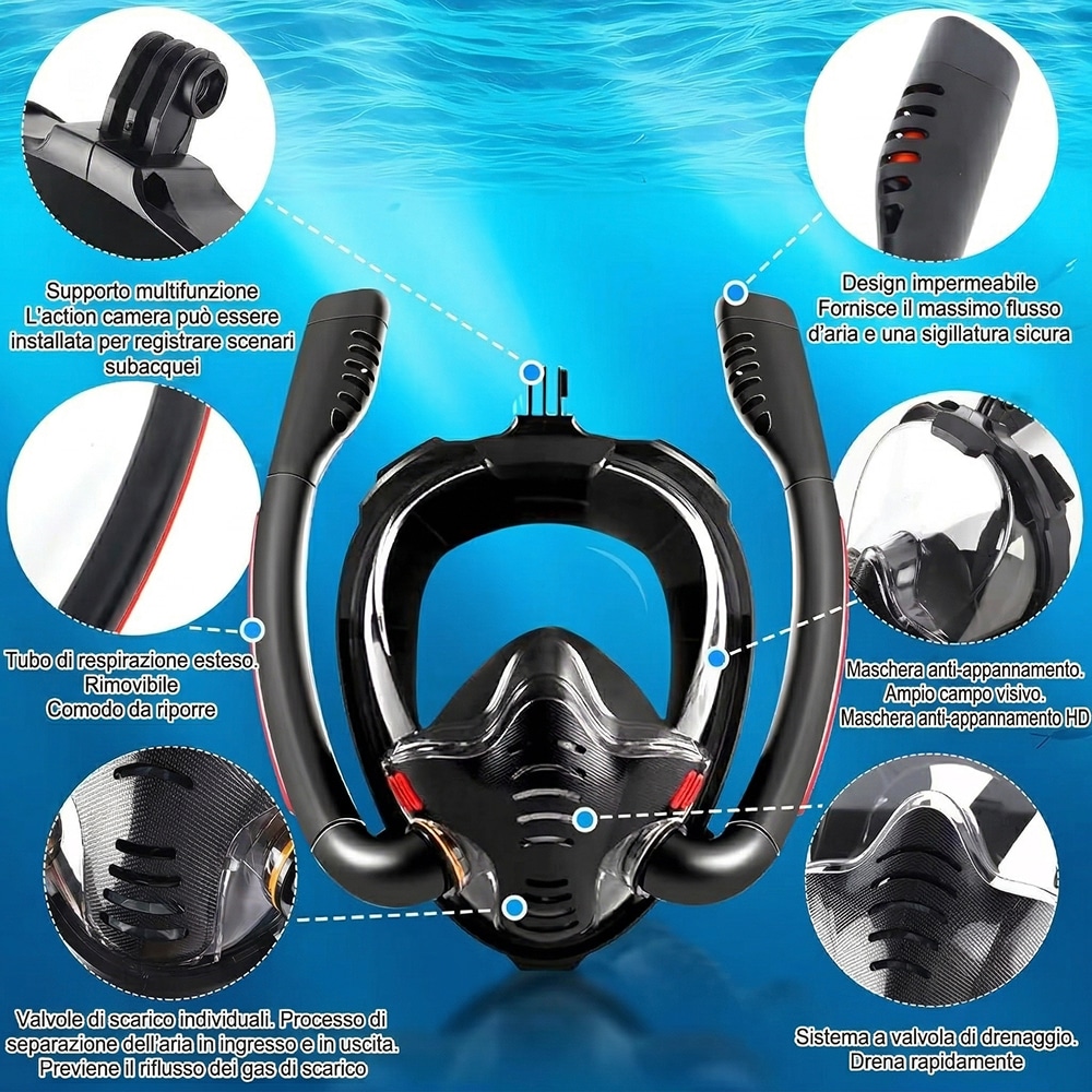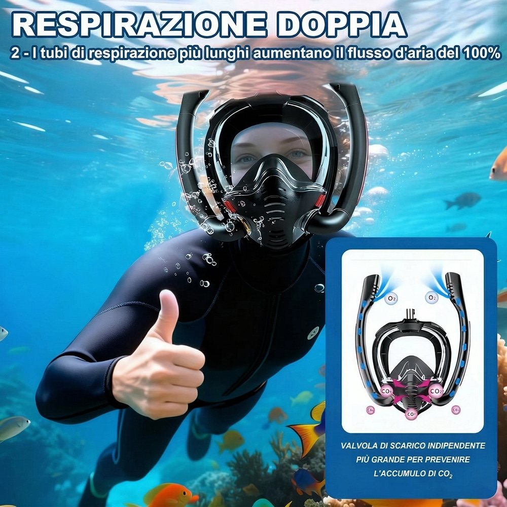 I doppi tubi aumentano l'apporto di ossigeno e facilitano l'espulsione della CO2, prevenendo l'affaticamento e garantendo una respirazione molto più naturale e sicura rispetto ai modelli singoli.